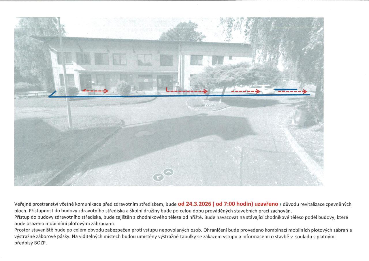 Z důvodu revitalizace zpevněných ploch před a kolem zdravotního střediska dojde v době od 24. března 2026 ke změně přístupu do budovy zdravotního střediska. Přístup bude zajištěn z chodníkového tělesa od hřiště a bude navazovat na stávající chodníkové těleso podél budovy (bližší informace v příloze).